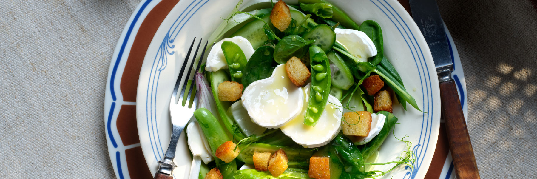 En enkel chèvresallad med gröna grönsaker, krutonger och skivor av Président le Chèvre. Salladen toppas med en mild dressing av honung, vit balsamico och olja.