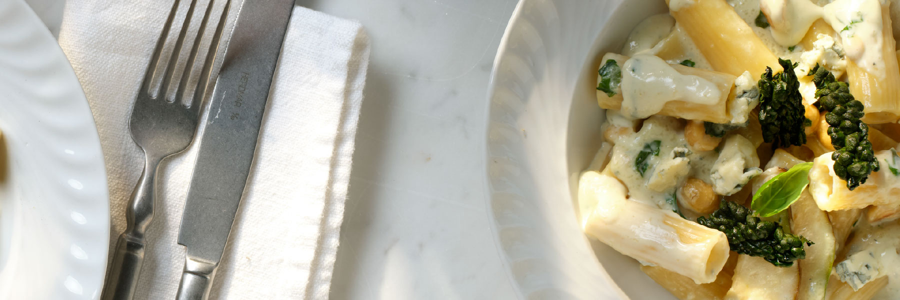 Krämig pasta med gorgonzola, svartkål och smulstekt salsiccia