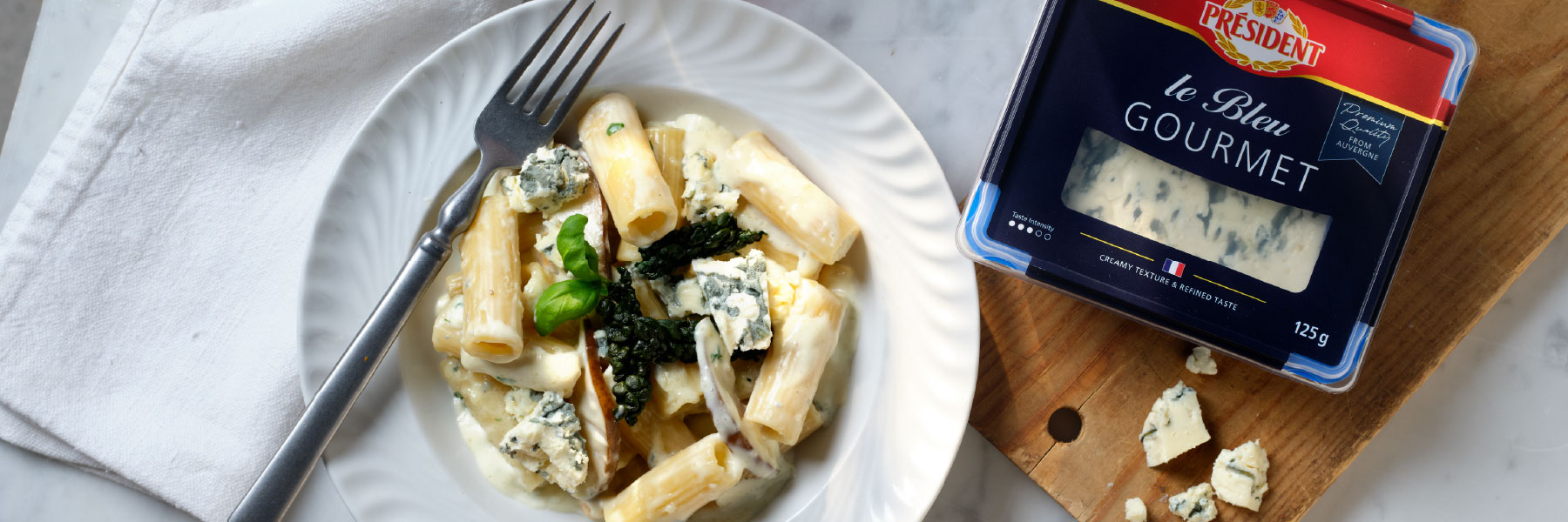 En mild och krämig pastarätt där päron, basilika och Gourmet Bleu ger en balanserad smak. Enkel att tillaga och fin att toppa med extra ost och färska örter.